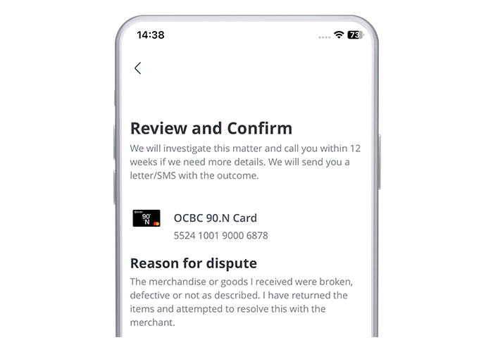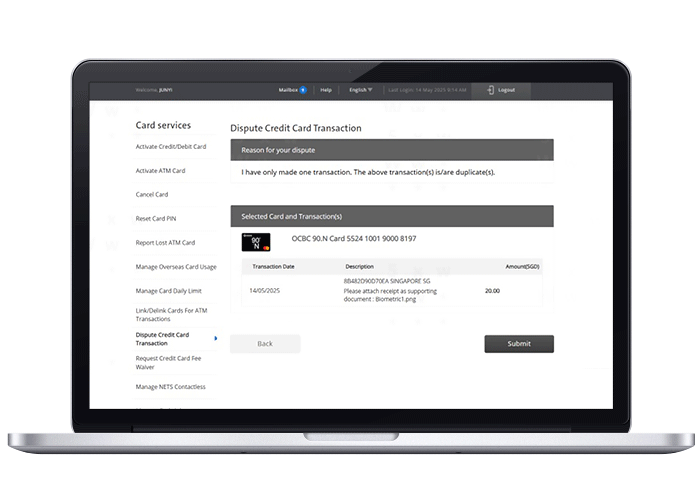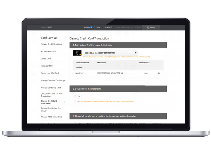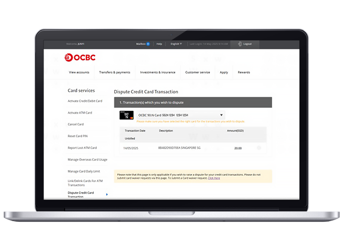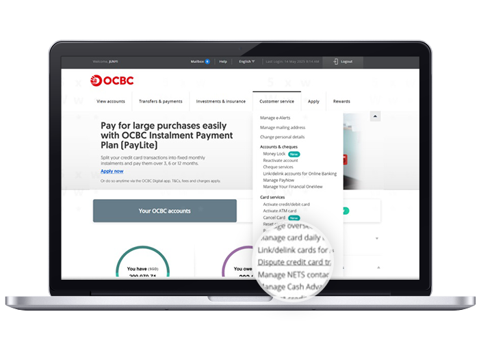 Click on Customer service and select “Dispute credit card transaction” under “Cards”.
