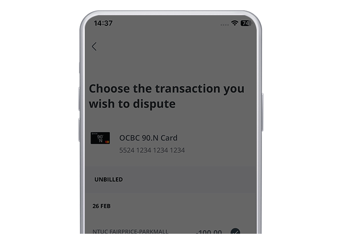 Select the card that you would like to request a dispute transaction for and choose the transaction you wish to dispute