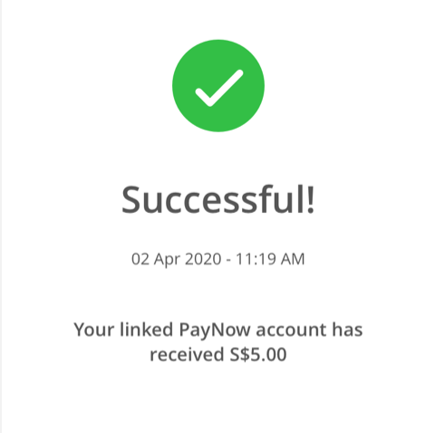 Once the fund has been credited into your linked PayNow account, a “Success” notification will be displayed on the app screen.