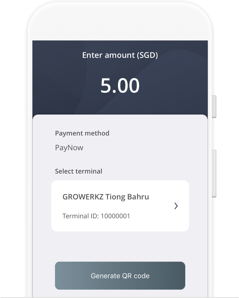 Tap on the dollar “$” sign icon within the main menu located at the bottom of the screen. When prompted, input the amount due for collection and click on the “Generate QR Code” button. A PayNow QR code will be created for your customer to scan and pay.