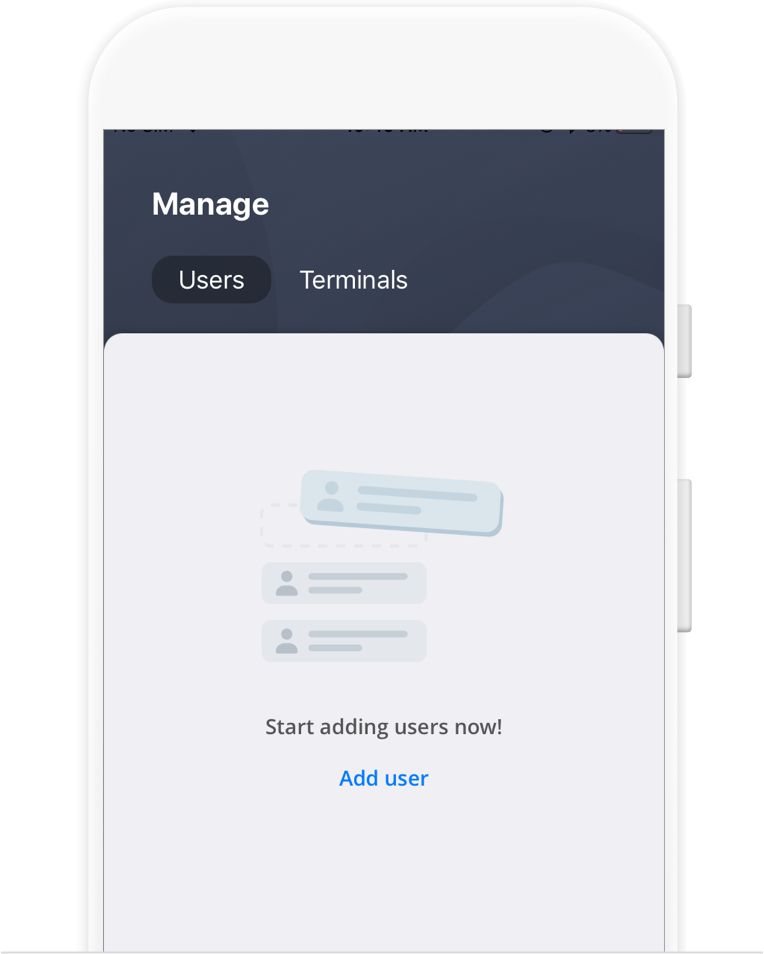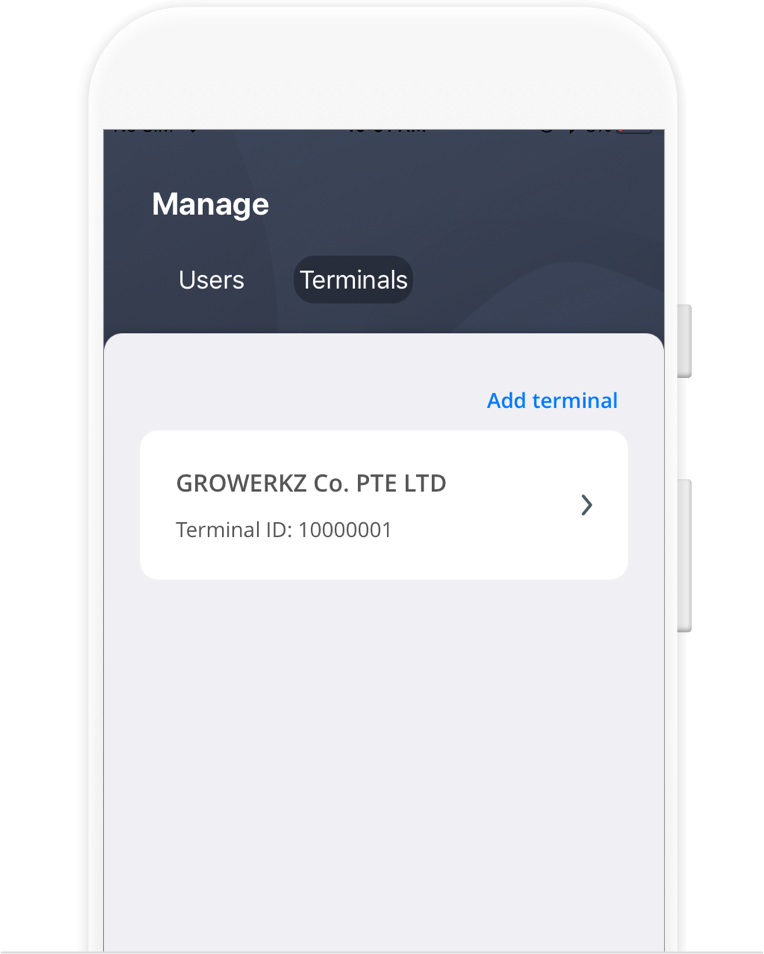 Open the app and log in using the registered mobile number. An OTP will be sent to the registered mobile number to complete the log in process. Once in the app, tap on “Manage”, “Terminal” and then “Add terminal” to represent your retail location. If you have several retail locations, repeat the above process.
