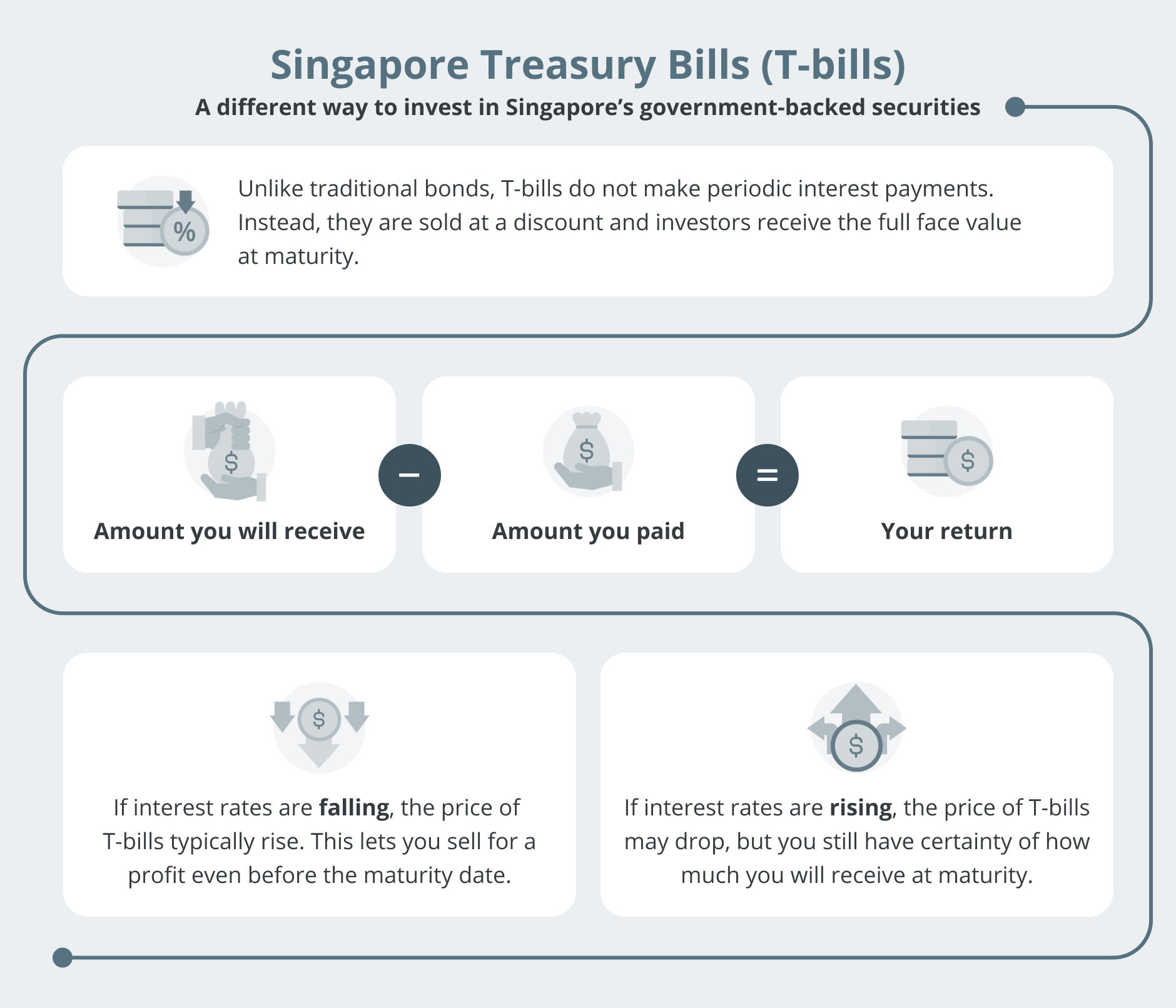 Singapore Government Securities (SGS) include SGS Bonds, T-bills and Savings Bonds that are backed by the Singapore Government.