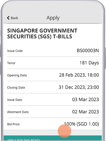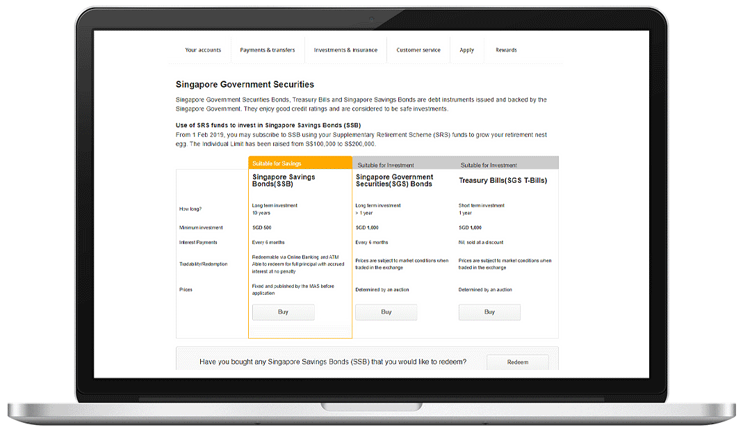 Singapore Savings Bonds are purchasable and redeemable online at full principal, with accrued interest paid to you at no penalty. SGS Bonds may also be traded in the exchange, and Treasury Bills through any of our branches.
