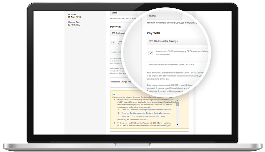 To apply with your CPF OA funds, you must have a CPF Investment Account (CPFIA) with OCBC. Before you can invest using your CPF SA funds, you will need to complete the CPF Investment Scheme Self-Awareness Questionnaire, located on the CPF Board's website.