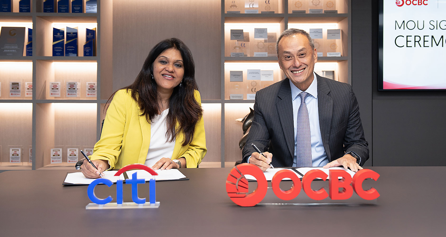 Citi Asia South Head of Services Ms Mridula Iyer (left) and OCBC Head of Global Markets Mr Kenneth Lai signed the Memorandum of Understanding.