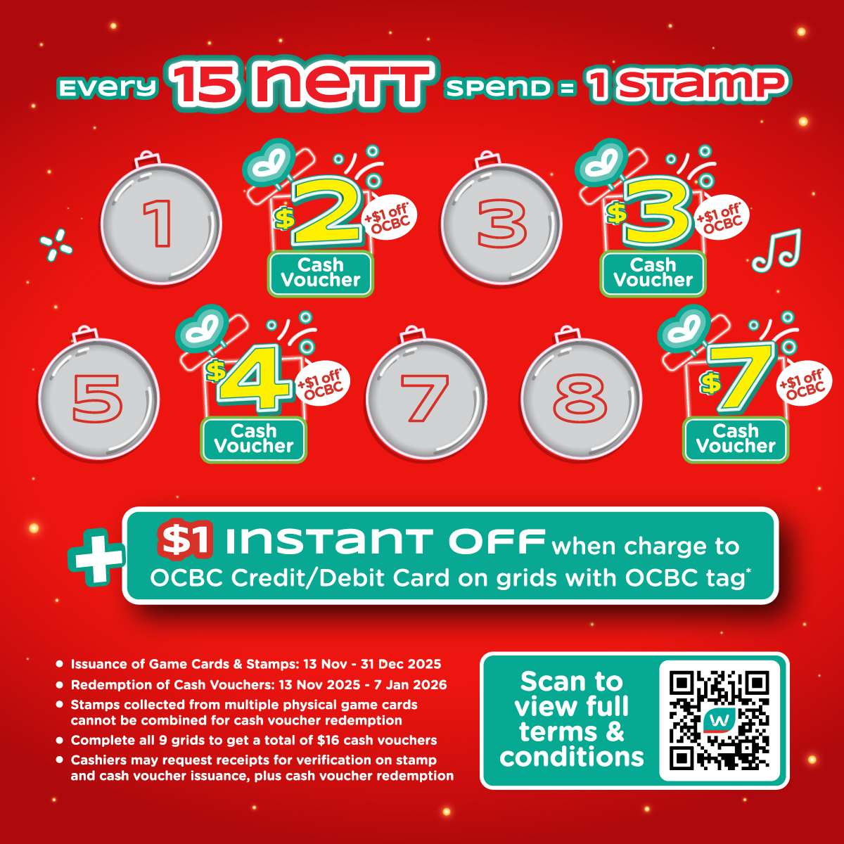Collect 1 stamp with every S$15 nett spend. Receive additional S$1 OCBC cash vouchers when you pay using your OCBC credit or debit card at the 2nd, 4th, 6th & 9th stamps of the Game Card.