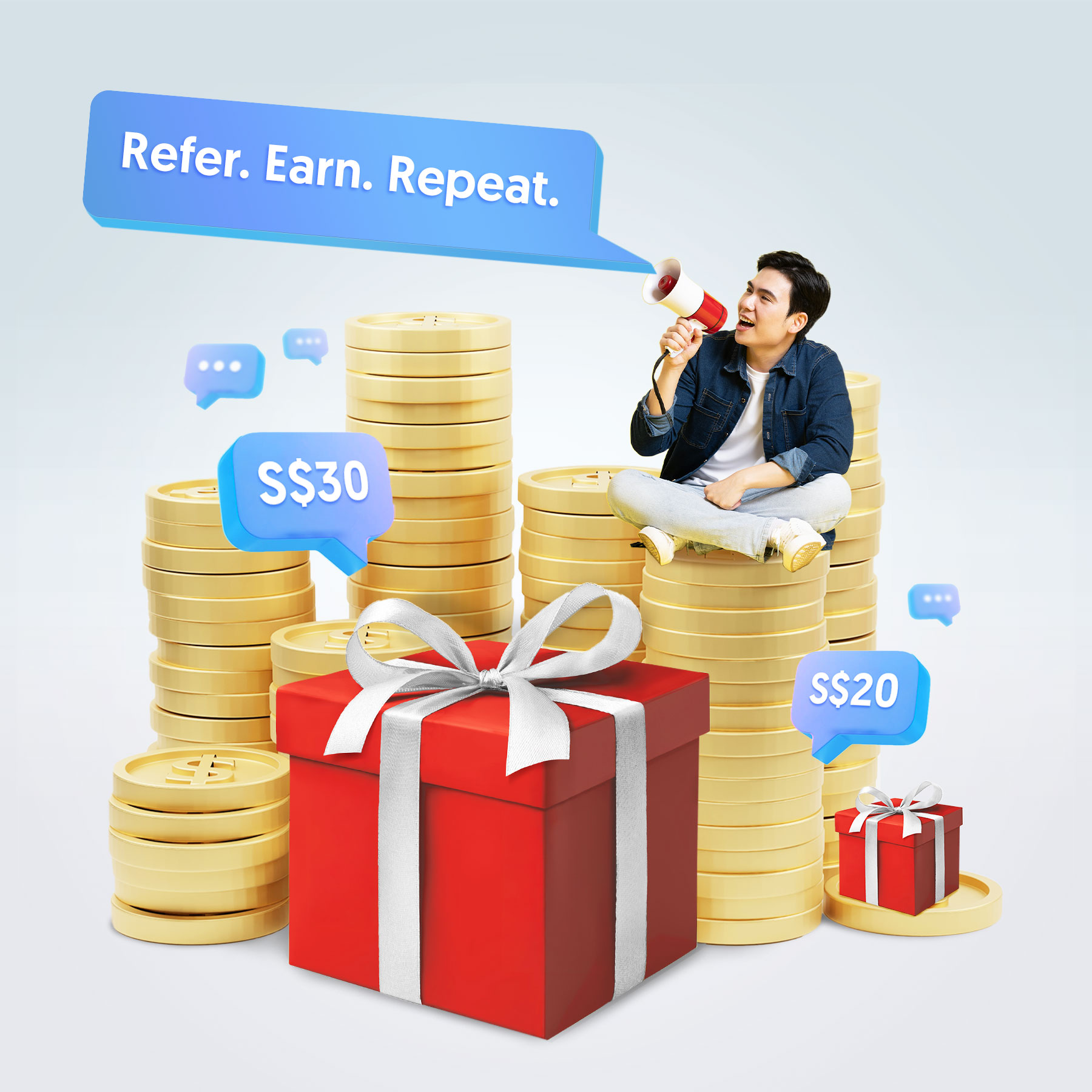 Example: 32 referrals = S$660 cash reward (S$20 × 30) + (S$30 × 2)