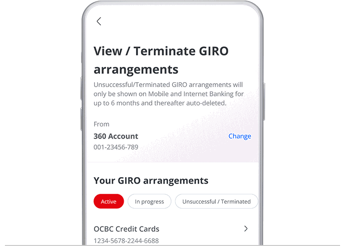 Select account to view its existing GIRO arrangements. Tap on a GIRO arrangement to view its payment details and tap "Terminate"
