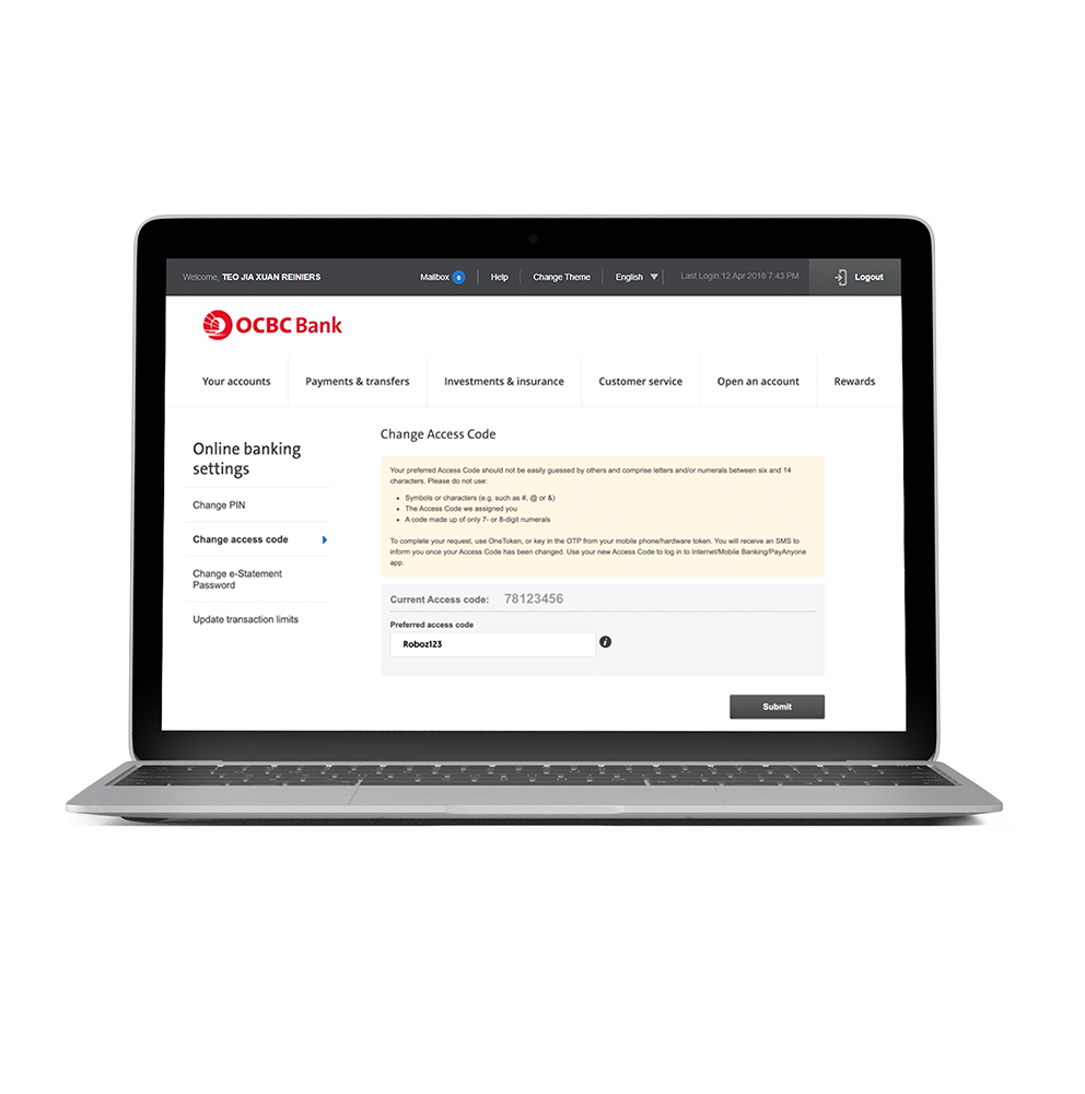- An Online Banking Access Code that you would like to use – it should not be easily guessed by others and comprise letters and/or numerals between six and 14 characters. Please do not use symbols, special characters or the Online Banking Access Code we assigned you. Do not choose a code made up of only 7- or 8-digit numerals.