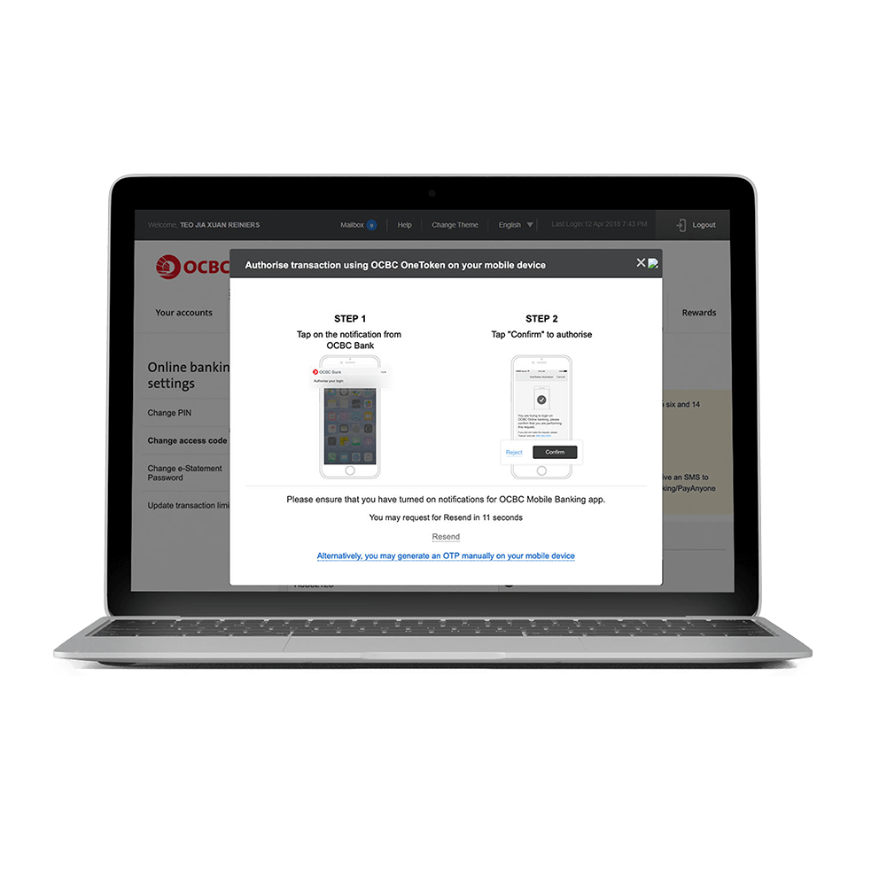 - OneToken, or One-Time Password (OTP) sent to your mobile phone or generated via your hardware token, depending on how you have chosen to receive the OTP