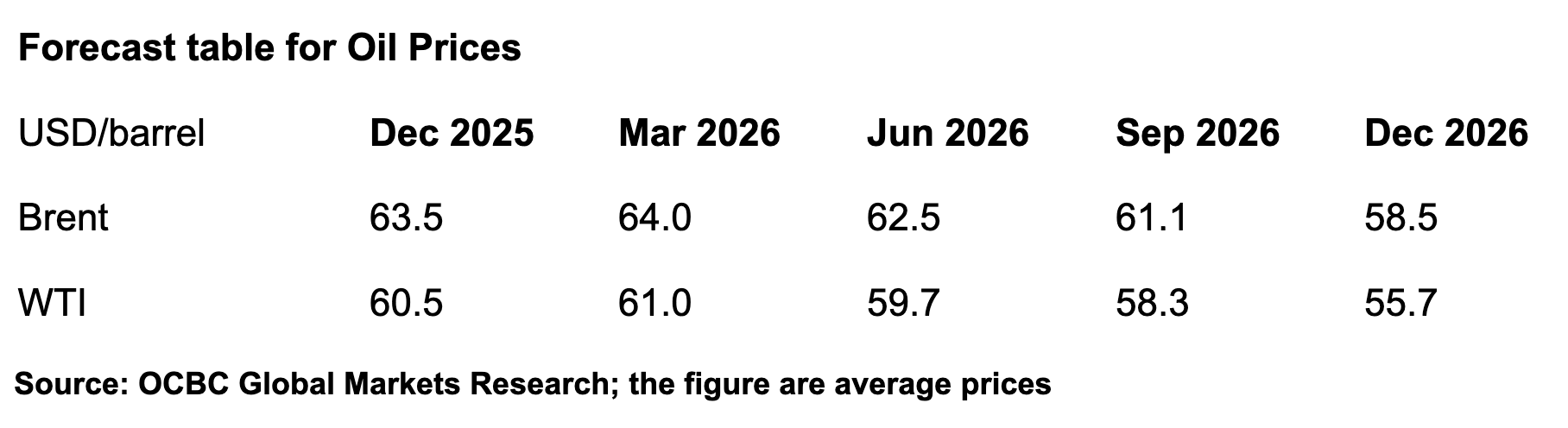 Looking ahead, we believe the volatility in oil price movements has stabilised, driven by a delicate balance between increasing OPEC+ production (OPEC+ announced another production hike for December) and concerns over supply disruption from US sanctions against key Russian oil companies. For 2026, we expect oil prices to ease further, with WTI and Brent averaging US$59/barrel and US$62/barrel, due to a favourable supply outlook.